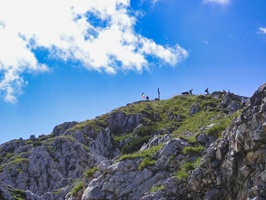 Am morgen des 15. August fuhren wir mir der Seilbahn auf den Untersberg und stiegen über den Salzburger Hochthron hinüber Richtung Mittagsscharte. Es war kühl, windig und regnete sogar etwas. Am Watzmann zeigte sich Neuschnee.