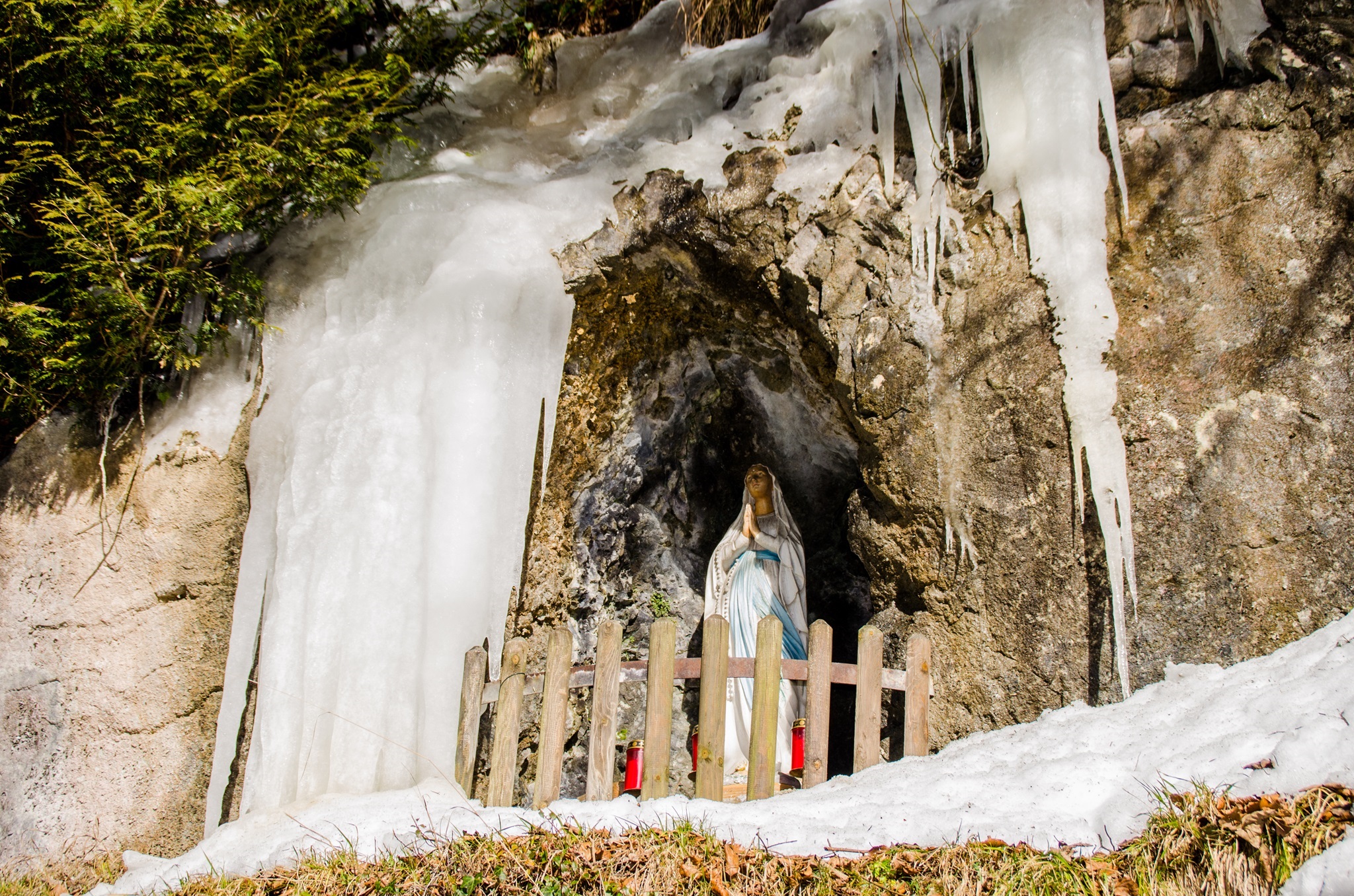 Es heißt, ein Gerer (Einheimischer von Maria Gern), habe die Madonna nach der Errettung aus einem Bergunfall hier bei der Quelle setzen lassen.