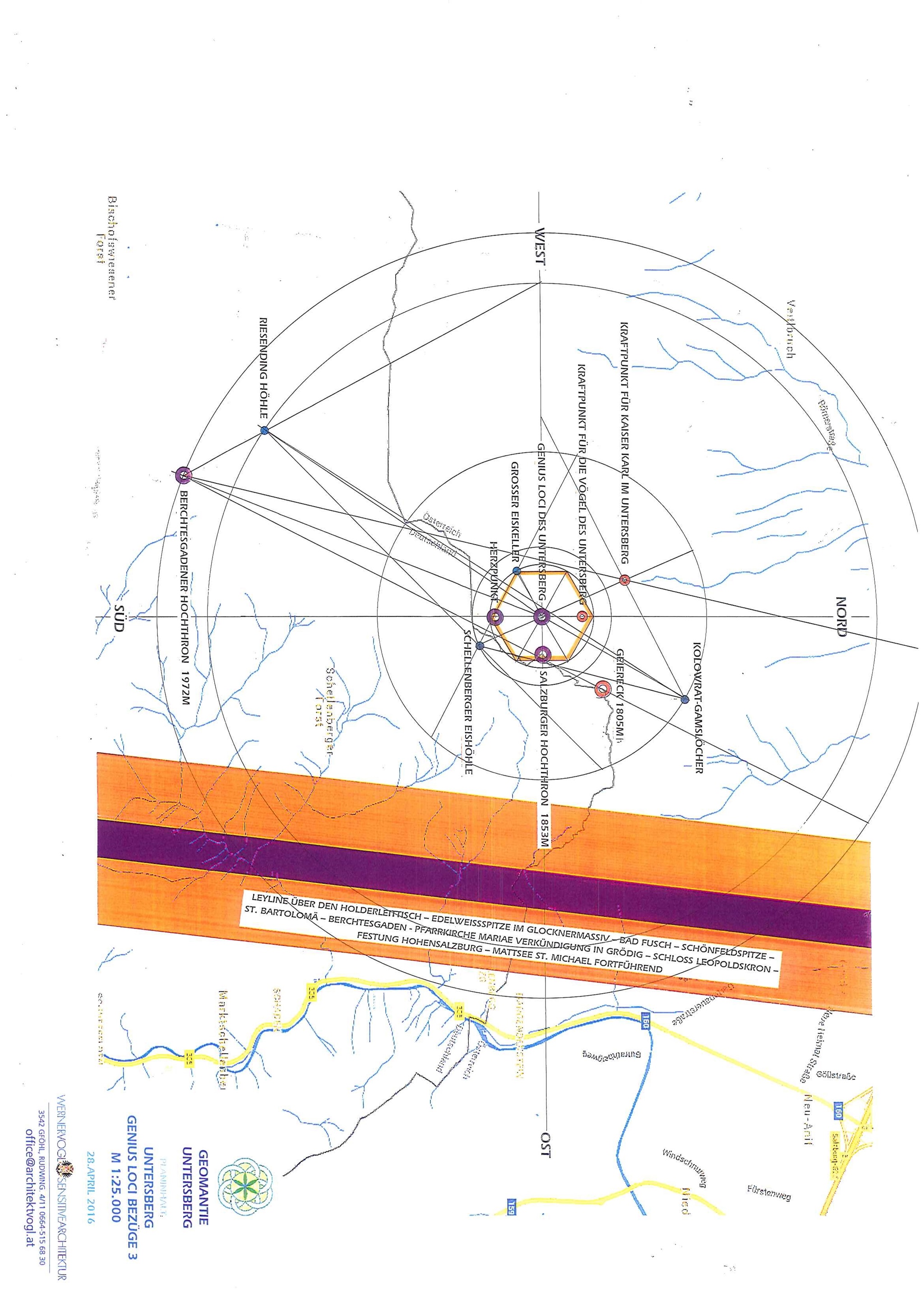 GL SBG zu 9,2 km Salzburger Hochthron 20° zu N/S = 2 x 20 = 40 = Neunstern GL SBG zu 8 km Kolowrathöhle 20° zu N/S = 2 x 20 = 40 = Neunstern GL SBG zu 8,4 km Zeppezauerhütte 20° zu N/S = 2 x 20 = 40 = Neunstern GL SBG zu 9,6 km Herzpunkt 20,5° zu N/S = fast Neunstern GL SBG zu 5,3 km Zistelam 3° zu O/W = 120-Eck =10 x 12-Eck GL SBG zu 5,3 km Gaißbergspitze 9° zu O/W = 40 = 8 x 5 GL SBG zu 5,3 km Birnbaum am Walserfeld, früherer Standort 15° zu O/W = 12-Eck und 6-Eck „Blume des Lebens GL SBG zu 7,6 km Gurlspitze 15° zu O/W = 12-Eck und 6-Eck „Blume des Lebens“ GL SBG zu 7,25 km Karlsohr am Untersberg 30° zu N/S = 6-Eck „Blume des Lebens“ GL SBG zu 4 km Schloss Hellbrunn 72° zu O/W = 5er Ordnung = „Schutzpentagramm“ GL SBG zu 4,5 km Schloss Kleßheim 36° zu O/W = 5er Ordnung = „Schutzpentagramm“ GL SBG zu 4,5 km Maria Plain, Schmerzenskapelle 0° zu N/S = Zahl 1 GL SBG zu 7,8 km Wallfahrtskirche St. Leonhard 0° zu N/S = Zahl 1