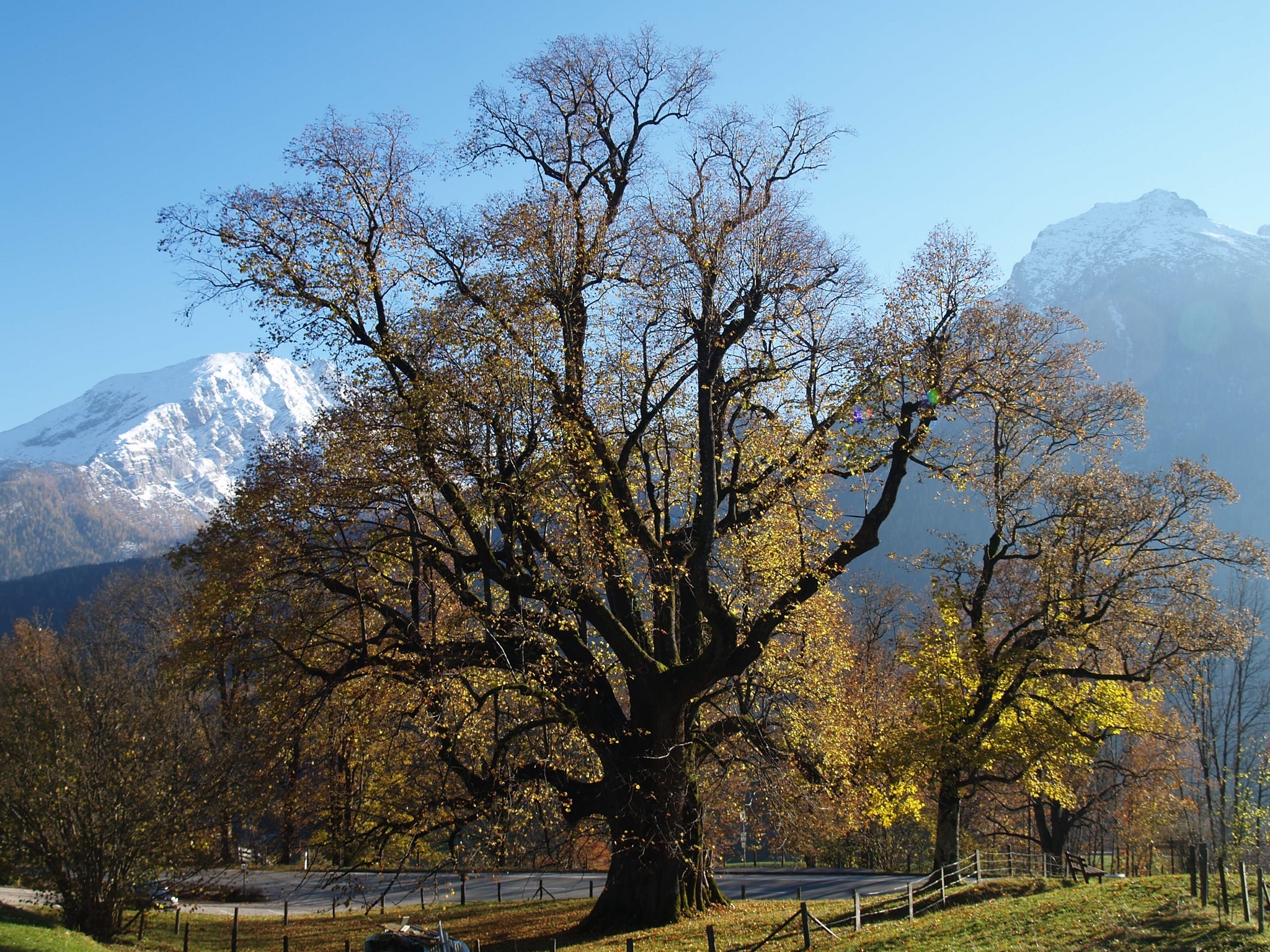 Vom Standort der Linde aus hat man einen grandiosen Blick auf Watzmann, Hochkalter und Reiteralm.