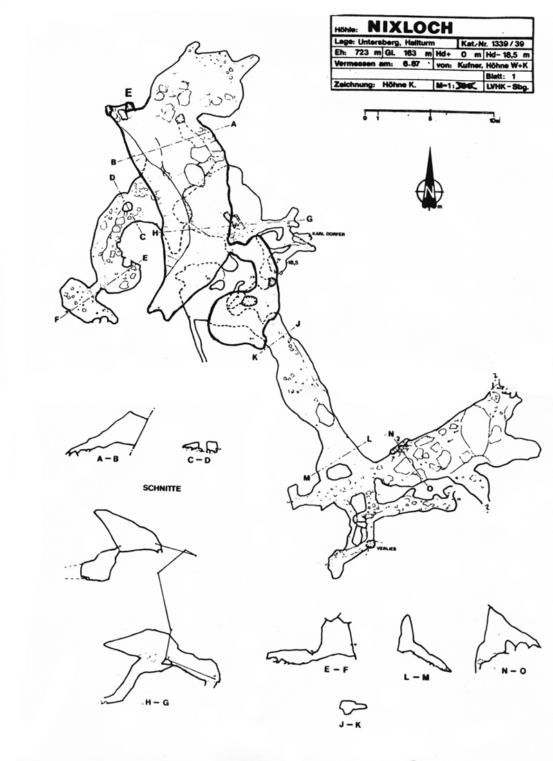 Höhlenplan vom Nixloch (Juni 1987) mit freundlicher Erlaubnis von K. Höhne, dem Erforscher der Höhle und dem ehemaligen Katasterwart des Landesvereins für Höhlenkunde.