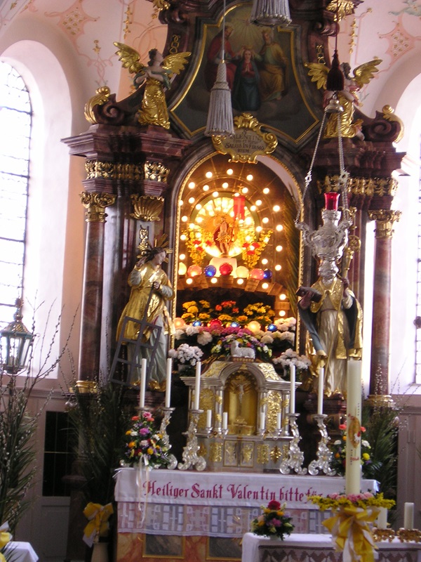 Sankt Valentin, ein Wohltäter, der sich dem Heil der Kranken gegen die „hinfallete Krankheit“ verschrieben hatte, war der Schutzpatron der Kirche.