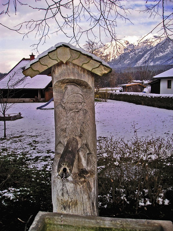 In der Nähe der Kirche steht auch ein Brunnen mit Untersbergmandlmotiv.