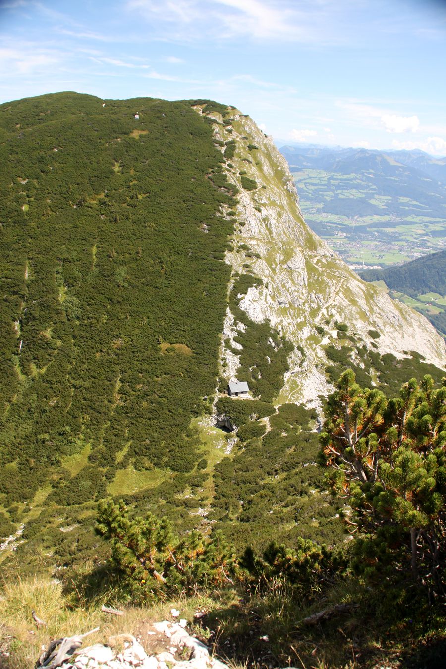 Die Mittagsscharte: Blick auf Steinerner Kaser (Hütte und Höhle darunter)