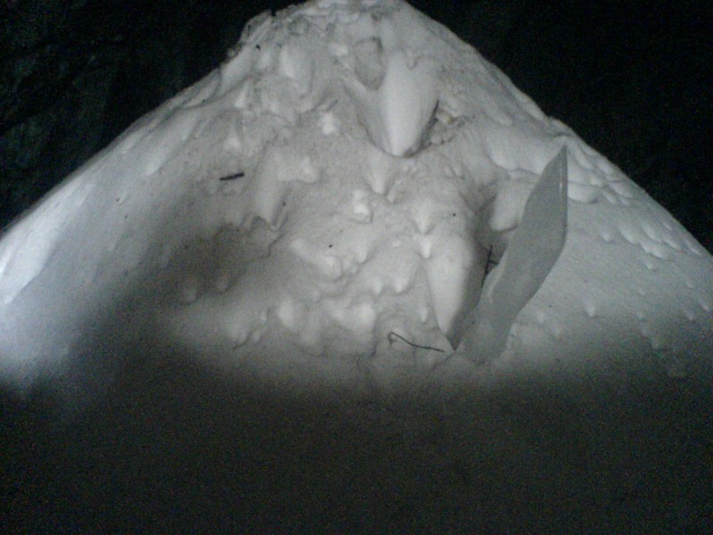 Am 9. Juni 2009 bestieg Annemarie H. aus Bad Reichenhall den Untersberg und wollte dabei auch in der Mittagsscharte die Höhle “Steinerner Kaser” (das Dimensionsportal) besuchen. Da in diesem Jahr Anfang Juni noch viel Schnee auf der Hochfläche lag, war es zunächst nicht vorherzusehen, ob die Höhle betretbar war. Über eine meterhohe, senkrecht zum Höhleneingang abfallende Schneeeinwehung konnte sie schliesslich kletternd das Höhleninnere erreichen. |